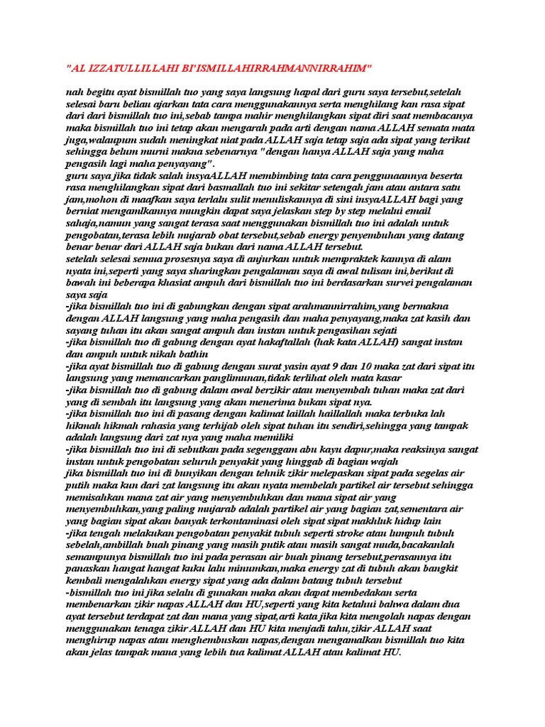Perasannya itu panaskan hangat hangat kuku lalu minumkan maka energy zat di tubuh akan bangkit kembali mengalahkan energy sifat yang ada dalam batang tubuh tersebut 9. 12032017 Â Â Bismillah membantu manusia untuk menembus selubung eksistensi material sehingga memperoleh jalan masuk ke barakah yang terletak didalam firman ilahi dan untuk mengenyam hakikat alam spiritual karena Bismillah itupun adalah suatu pengejawantahan visual dari kristalisasi realitas-realitas spiritual. Jumat 07 September 2012 Terbukanya Bismillah Tuo RANJI BISMILLAH TUO Assallammualaikum warahmatullahi wabarokatuh Salam penuh hormat merunduk kan kepala saya merangkupkan jari tangan kepada saudara saudara pembaca yang ilmu dan kepahamannya jauh di atas melebihi saya.